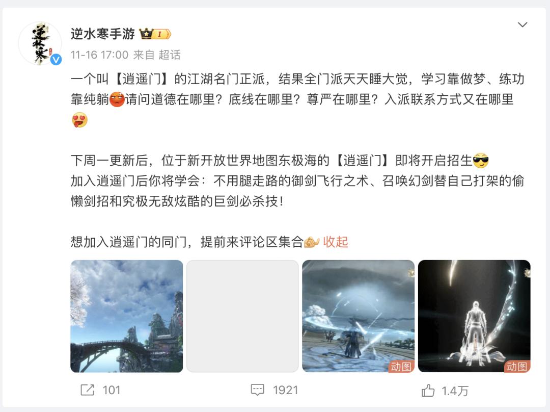 带着粉丝一起“疯”?《逆水寒》手游官微名,是就让玩家自己票选(票选出“真尼玛得劲”,于是官微自称“珍妮”)。