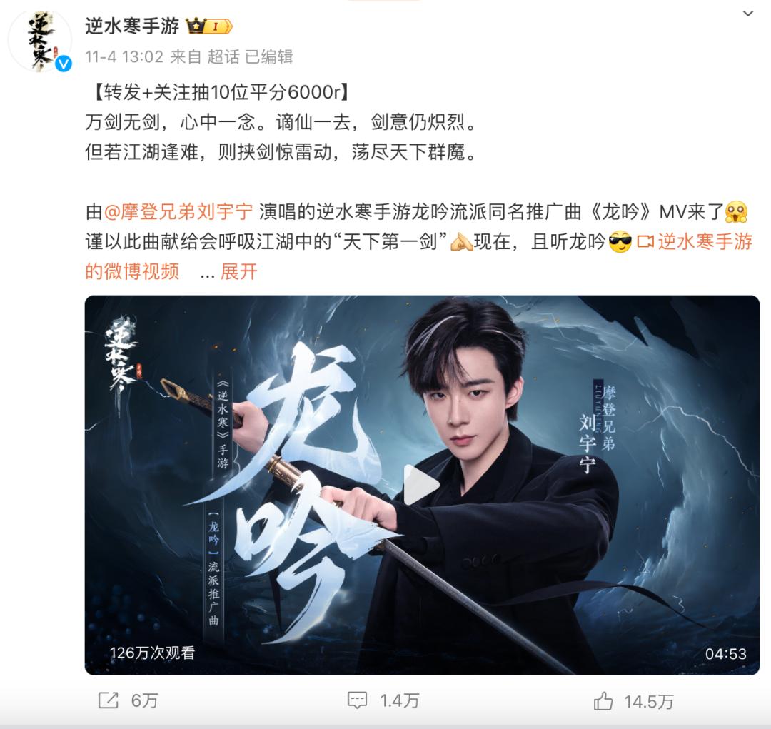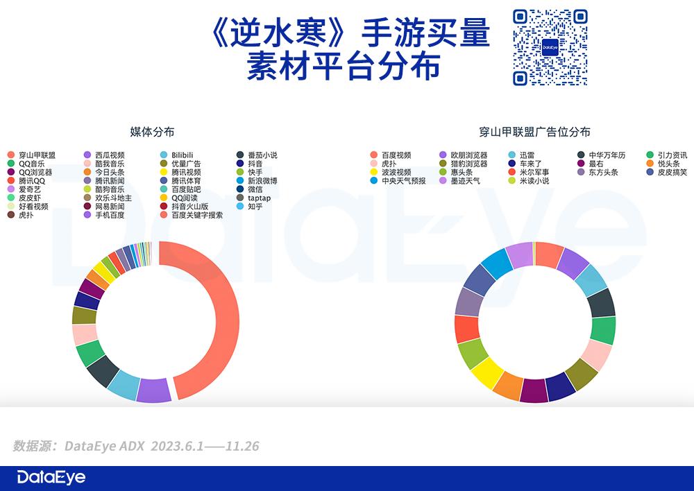 ADX数据显示,6月以来截至11月26号,《逆水寒》手游买量投放的主投平台,主要是穿山甲联盟、B站、西瓜视频等,微博仅占0.79%。《逆水寒》手游无意在微博买量投放,完全靠“发疯”获得流量。