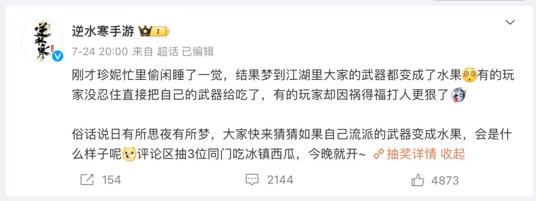 先说结论:逆水寒IP在微博发疯,只产生了一次TOP级高赞微博(即抽奖送房)。其他TOP级高赞微博,主要是明星IP、送手机等;不过、逆水寒IP在微博的评论量,却是持续活跃,这才应该归因于官微人设。