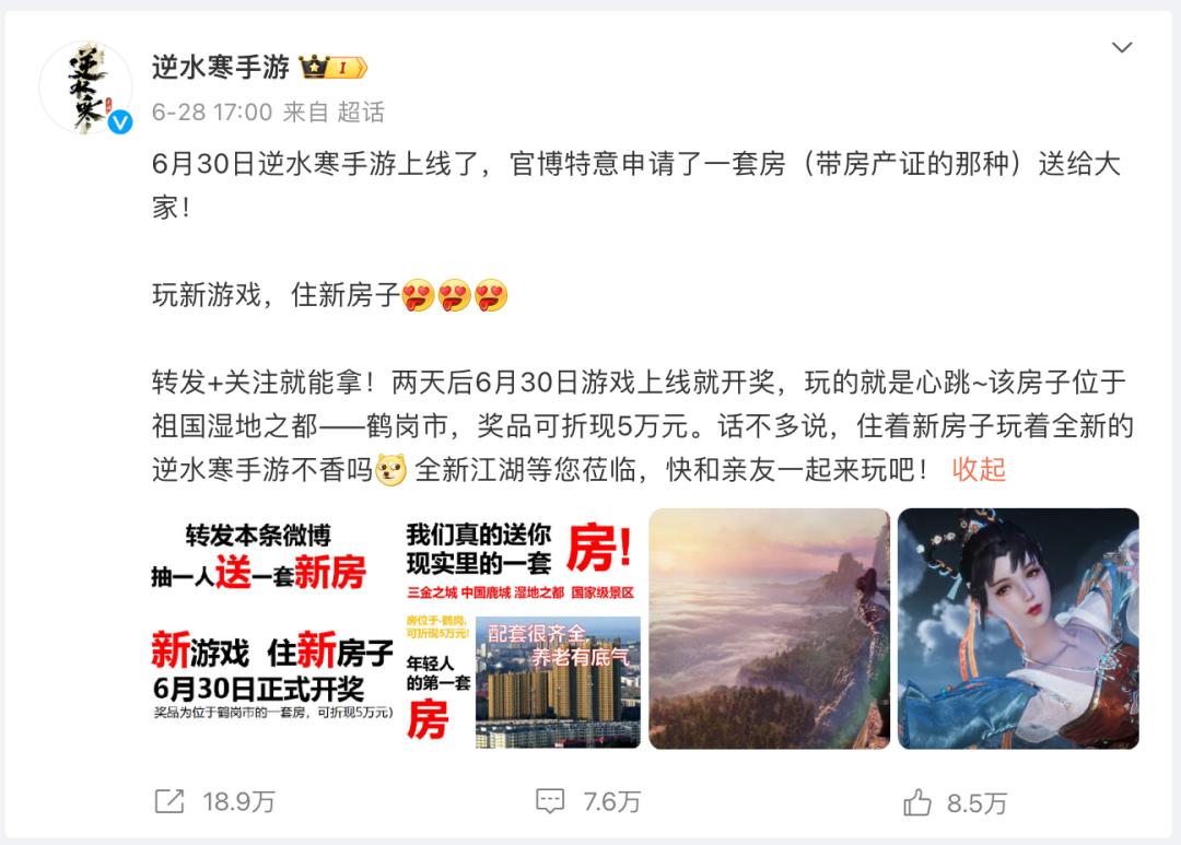 游戏,特别是中小厂新游,做微博号之难、积累初始粉丝之难!微博抽奖都在送房了!就是一大标志。可想而知有多难、有多卷。如果你项目有官微,相信你会有感触。
