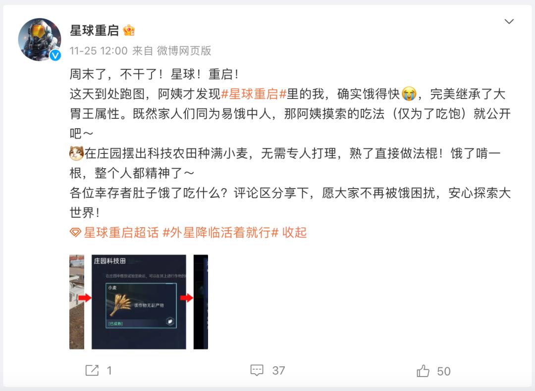 这进一步导致,其一微博不适合娱乐属性不强的原生内容获取自然量;其二微博更适用于头部厂商/头部游戏,腰尾部产品如果天然没关注度,很难从0开始积累。《星球:重启》此前不缺经费,之前又是抽奖又是整活买微博达人,粉丝也就13万,日常微博也就几十个转发评论,即使是日常“发疯”也没有太大变化。
