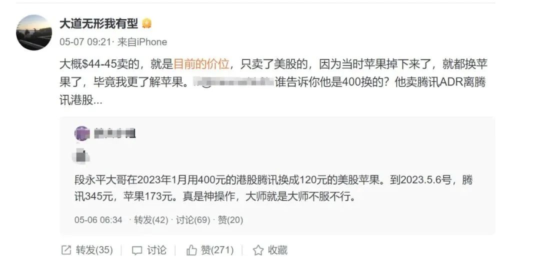 而就在腾讯控股2023年初持续反弹之际,他却在平台上表示,“美股的腾讯基本上全部换到苹果了,港股的还没动。”