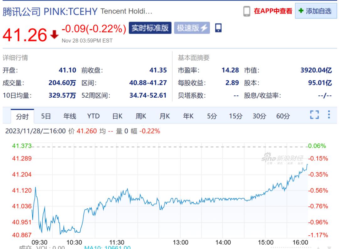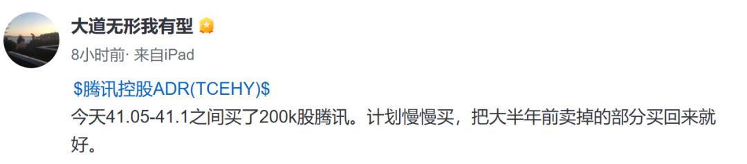 11月29日,段永平在雪球上表示,美东时间的周二,在41.05美元-41.1美元之间买了20万股腾讯。
