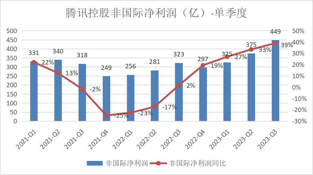 11月15日,腾讯控股发布三季报。财报显示,腾讯公司实现营收1546亿元,同比增长10%,基本符合市场预期;非国际财务报告准则下归母净利润(以下简称“非国际净利润”)449亿元,同比增长39%,高于彭博一致预期的395.7亿元。