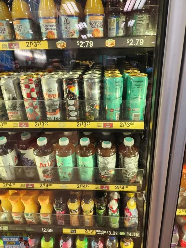 AriZona冰茶(从上数2、3排)与其他饮料的个头对比,图片来源:Reddit