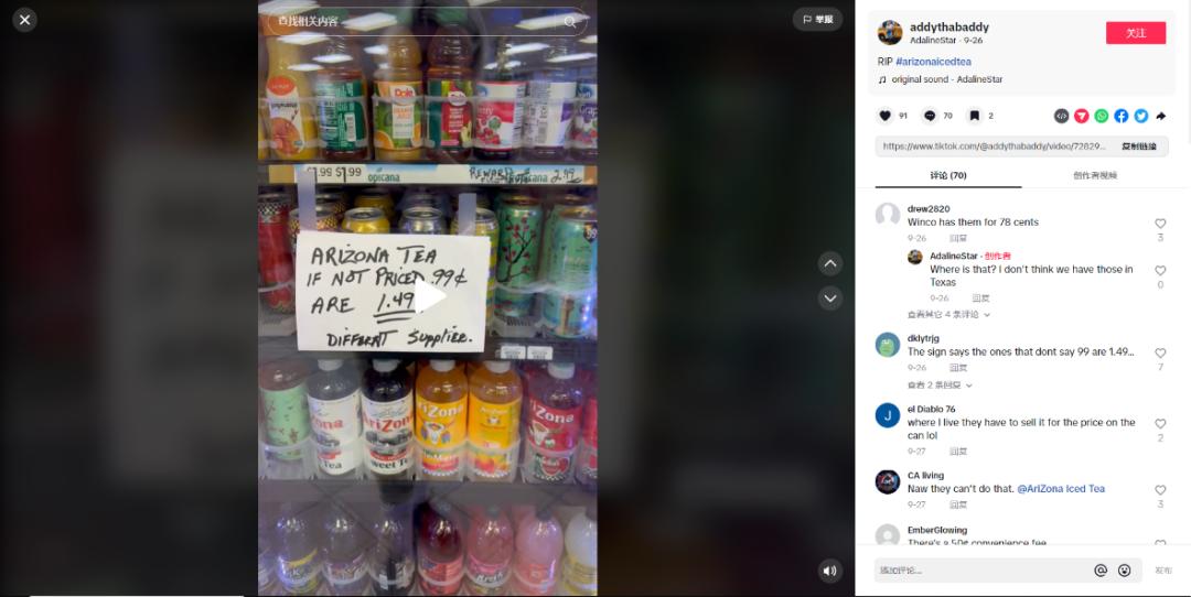 先是美国的一些零售商开始坐不住了。在TikTok上,美国网友反映,有零售商为了多赚取一点利润,对AriZona罐装冰茶“坐地起价”,罐身上的99美分标志,被强行用一张2.99美元的价格标签覆盖。甚至还有零售商更简单粗暴地在冰柜的玻璃门上,贴上一张写有“AriZona冰茶不卖99美分,卖1.49美元”的告示。目前坐地起价的现象主要存在于个体户,但也有网友发现,在美国连锁便利店Circle K,AriZona的价格也被调整到了1.29美元。