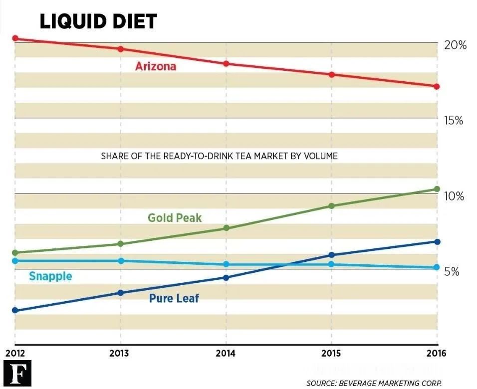 便宜且稳定,也成了AriZona罐装冰茶最大的竞争力。在品牌诞生后几年的时间里,AriZona罐装冰茶就凭借低价优势击败了最大的竞争对手Snapple,成为美国销量最高的冰茶。[1]