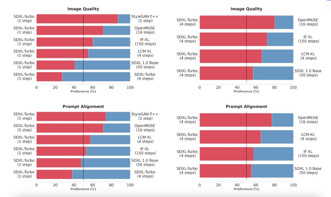 为了选择 SDXL Turbo,研究团队通过使用相同的提示词生成输出来比较多个不同的模型变体(StyleGAN-T++、OpenMUSE、IF-XL、SDXL 和 LCM-XL)。然后,人类评估者会随机看到两个输出,并被要求选择最符合提示方向的输出。接下来,用相同的方法完成图像质量的附加测试。在这些盲测中,SDXL Turbo 能够以一步击败 LCM-XL 的 4 步配置,并且仅用 4 步击败 SDXL 的 50 步配置。通过这些结果,我们可以看到 SDXL Turbo 的性能优于最先进的多步模型,其计算要求显着降低,而无需牺牲图像质量。