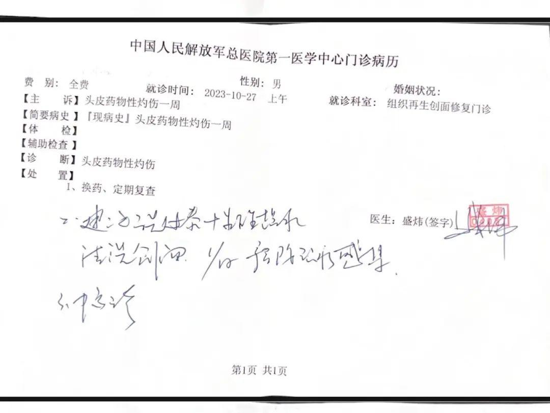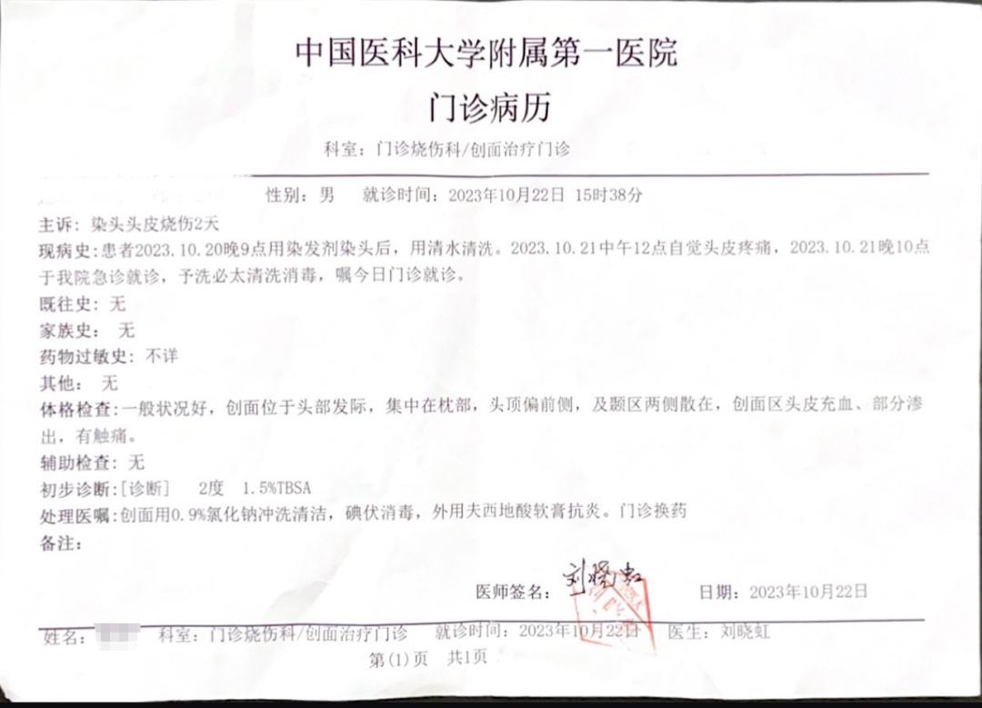 据李某描述,其在当时就感觉到了头皮疼,但发型师却说这是正常反应,忍忍就好。可次日早上,李某发现其“头皮和头发都是湿湿的”,照镜子后发现整个头皮已流血化脓,于是当天去到医院急诊。10月22日,烧伤科的医生表示为二度烧伤。