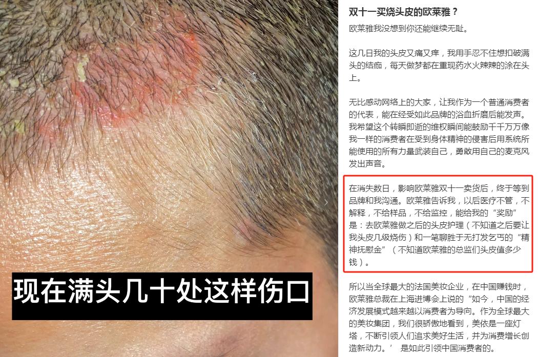但就在11月3日,李某更新了维权进展,并对欧莱雅方给出的解决方案表示不满。据李某介绍,欧莱雅方对此事的态度是“以后医疗(费用)不管,不解释,不给样品,不给监控”,仅提供后续头皮护理服务和给予一定的补偿金。