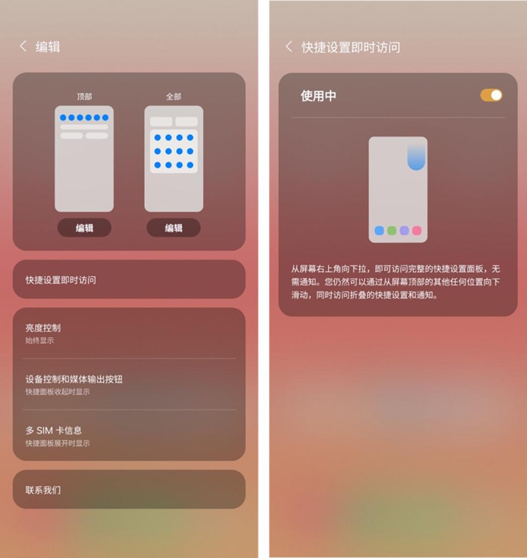 为了匹配这种变化,快捷面板设置项也增加了几个选项,我们可以自由定义缩小和展开状态下的开关顺序,以及亮度、设备和媒体控制、SIM 卡管理的显示逻辑。One UI 6.0 还为快捷面板新增了一个「即时访问」功能,从屏幕右上角下拉即可直接完全展开面板。不过这个功能也并非是 One UI 特色,国产定制系统在这方面走在前列。
