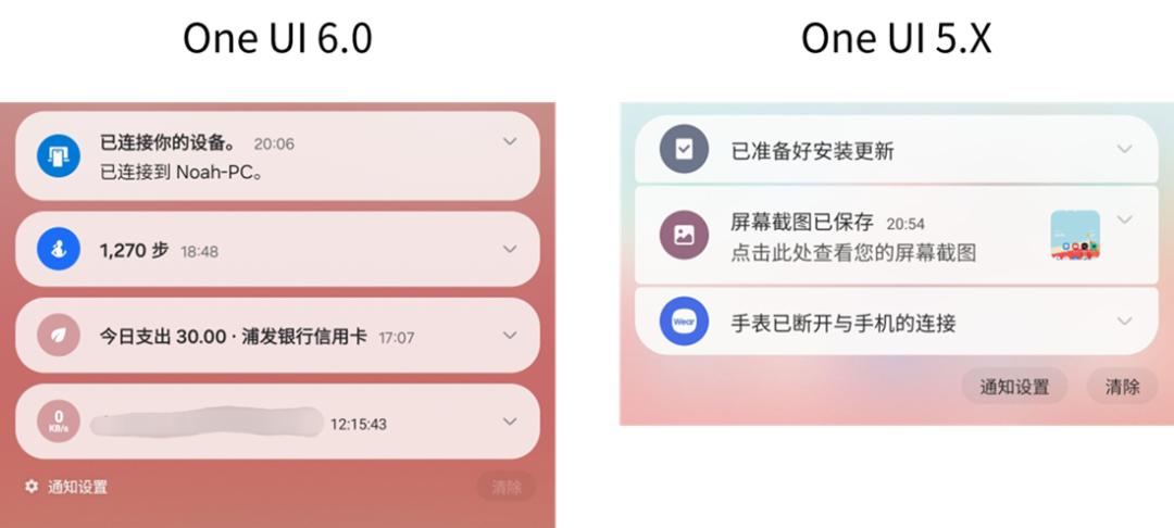 而更新至 One UI 6.0 后,通知条目全部独立显示,单个通知占用面积变大、整体效果更有 iOS 的影子。并且在这种机制下,即使我们把常驻通知设置为最小化,这些通知所占用的面积并没有缩小,看起来还是那样「丰腴」。