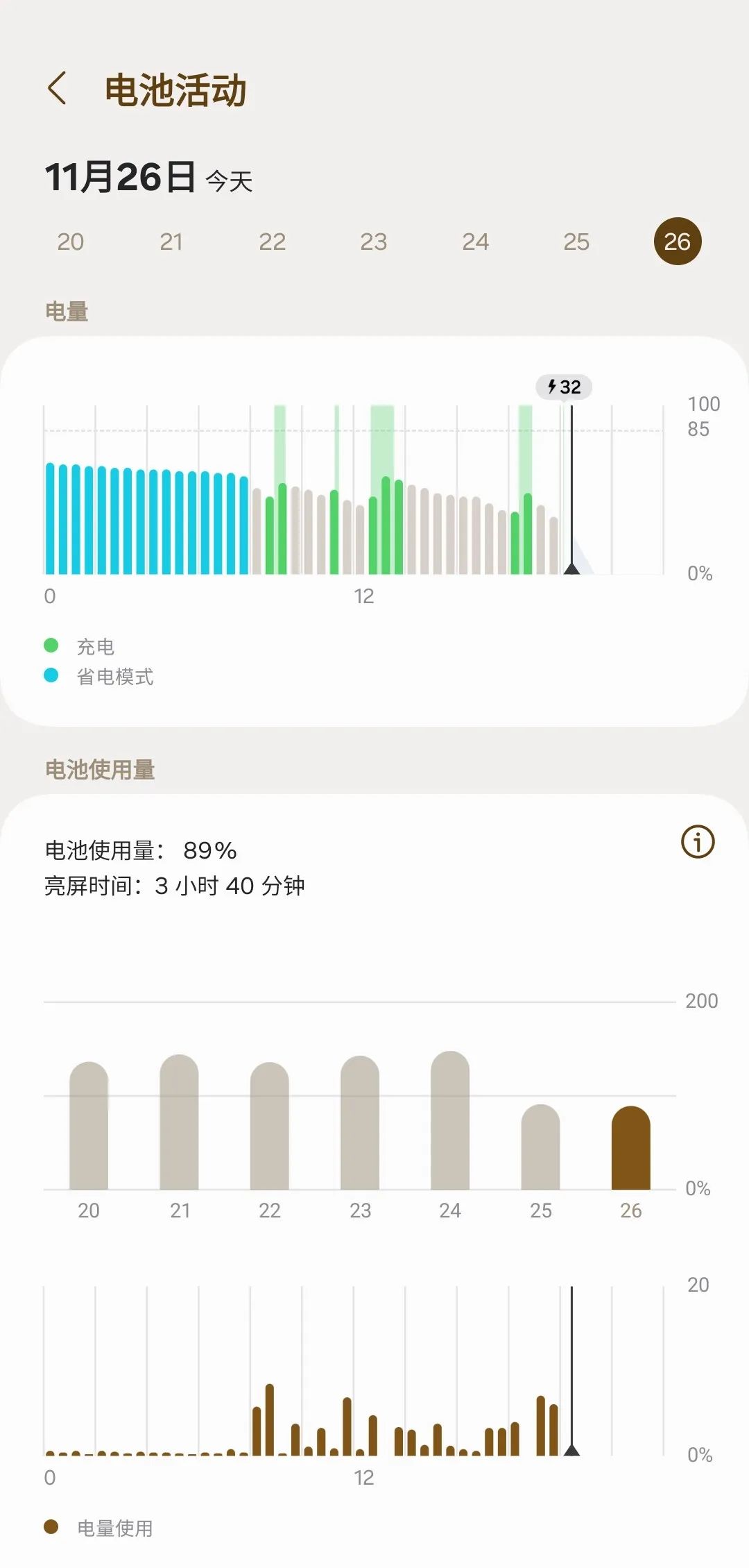 比如 One UI 6.0 将电池使用统计由「自上次充满电后」变成了「今天」。有许多用户认为这些统计数据原本更能反映出真实续航,也能从中观察到电池衰减情况,但调整后的数据几乎没有参考性,还不如放到「数字健康」当中用来提醒自己今天摸了几个小时鱼。
