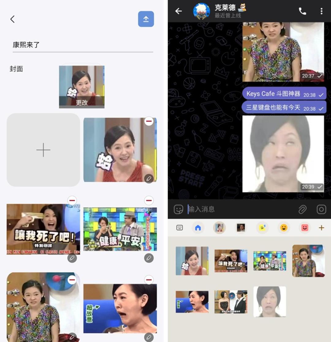 另一个非常值得推荐的功能则是用来创建表情包,你可以通过 Keys Cafe 将多个图片(支持 GIF)创建成一个键盘贴纸合集,并在任意支持的应用中使用这些贴纸。使用时就像选择 emoji 一样切换到表情键盘,点击即可完成发送。这个功能可比在某「绿色聊天软件」中添加表情包来得更实用一些。