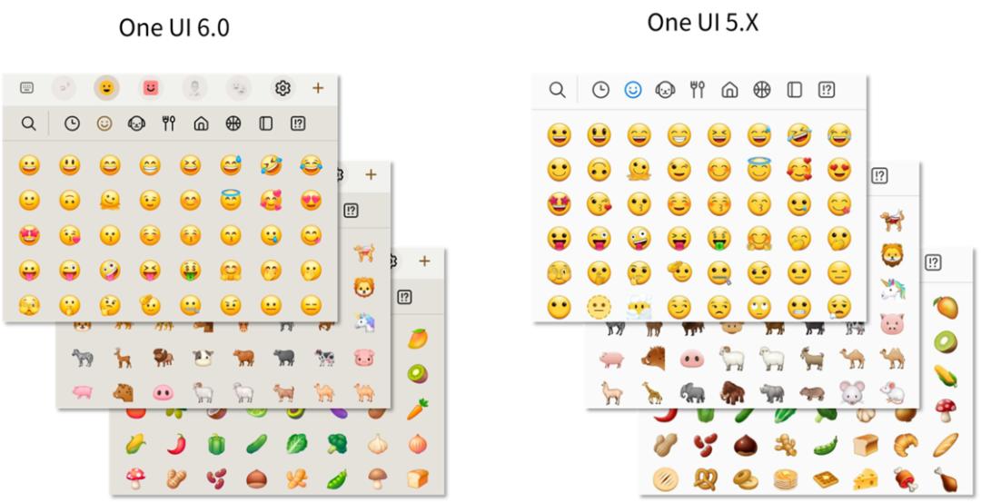 如果你没有使用第三方输入法,那你一定会发现 One UI 6.0 还调整了 emoji 表情外观。三星所使用的 emoji 表情其实从 Samsung Experience 时代就没有太大变化,外观类似于 Apple 风格。新的 emoji 外观并没有采用 Android 通用样式,但自己又造了一个轮子。主观评价虽然谈不上「丑」,但至少给我一种「肉毒打多了」的观感。