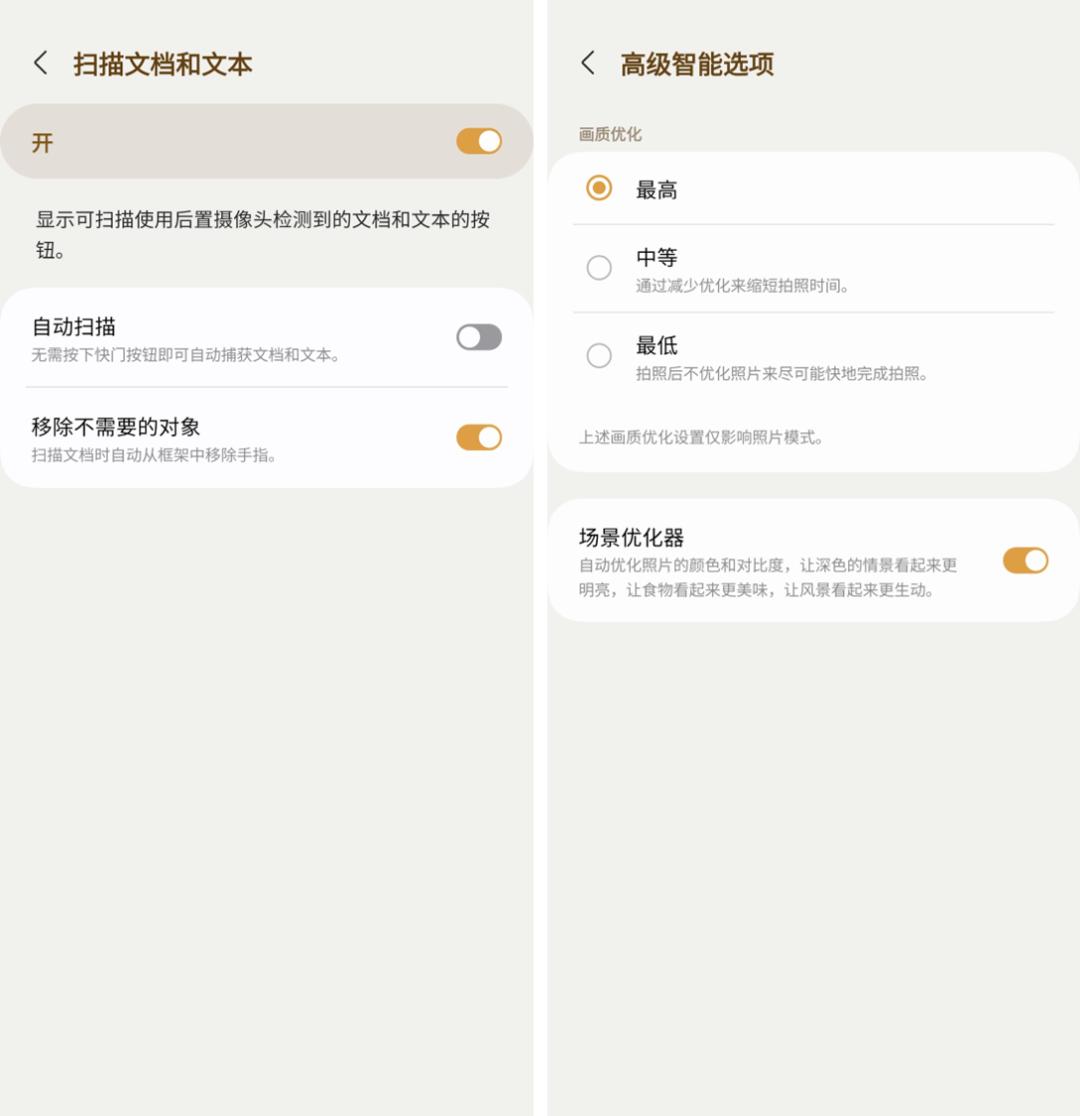 扫描文件功能从「场景优化器」里剥离了出来。后者是针对不同拍照场景进行照片优化的功能,包括对文档扫描的识别。不过很多时候「场景优化器」会识别错误或者「用力过猛」导致拍出来的照片失真。One UI 6.0 将这两项功能分开之后,即使「场景优化器」被关闭了也能够识别到文档并进行扫描处理,总归来说还是更合理也更方便一些。