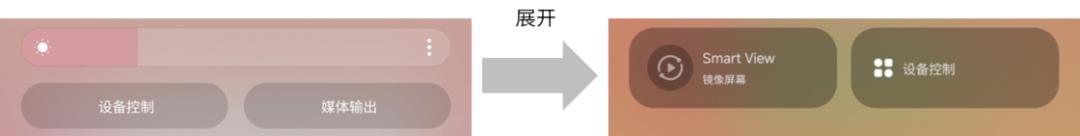 最让我不解的则是「设备控制」「媒体输出」和「Smart View」这三个功能控制入口。在快捷面板缩小状态下,前两者分列左右两边;而下拉展开后,「设备控制」又转移到了右侧,左侧则显示「Smart View」。无论从操作便利性、功能关联性还是动画逻辑出发,我都推断不出这种变化存在何种规律,只能认为是产品经理「点兵点将」排布上去的结果。