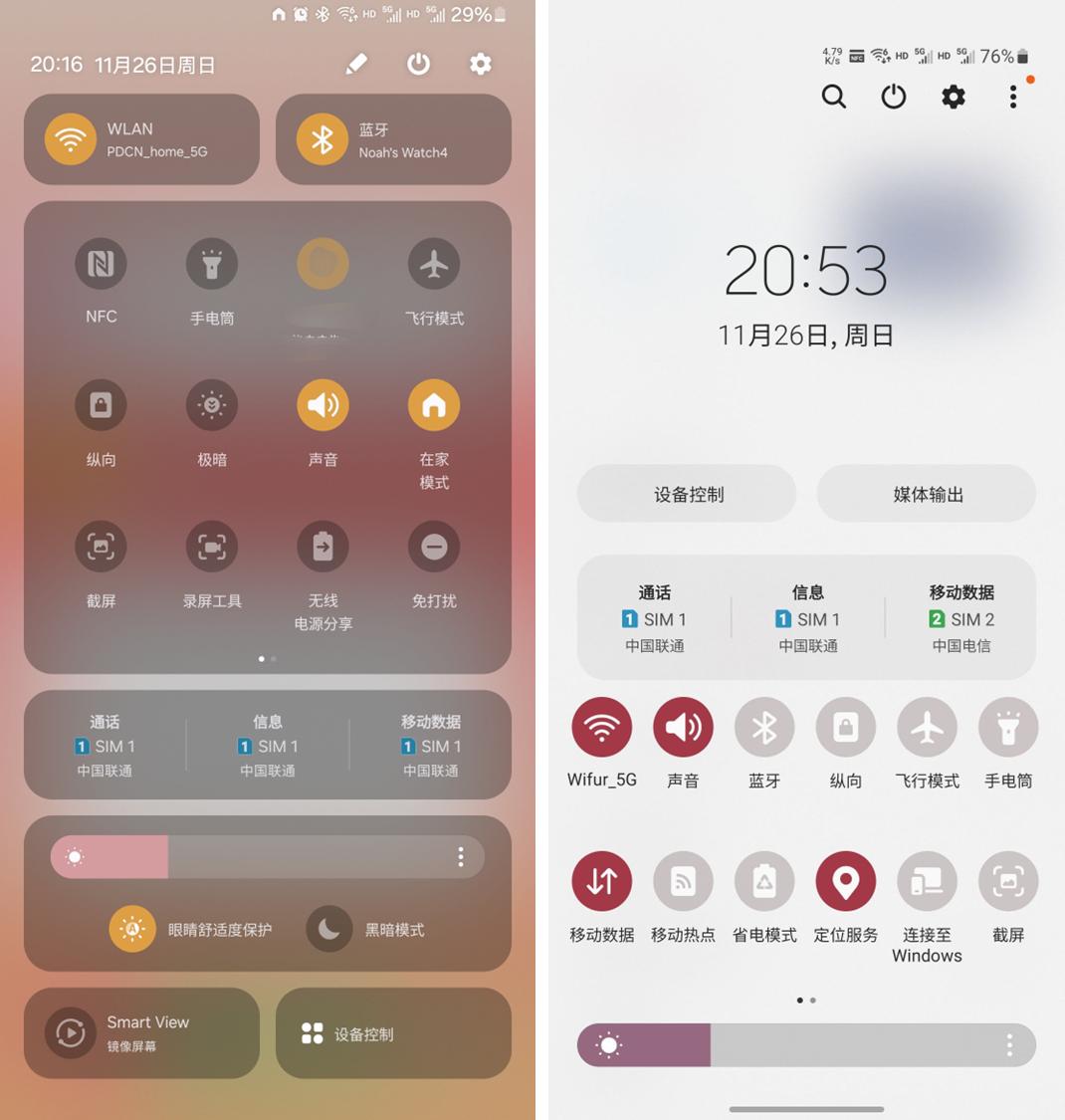 新的快捷面板可以说完全抛弃了 One UI 原本「单手操作、重心下移」的设计理念,整体效果反而与不少国产定制系统类似。暗色模式和舒适度保护则独立显示——但它们俩真的有必要单列吗?