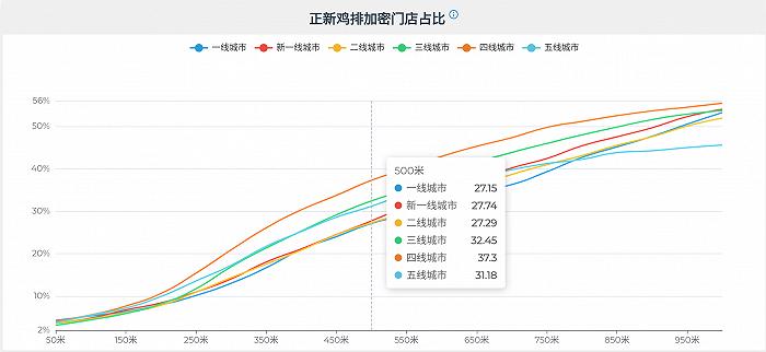 从极海品牌监测的数据来看,在门店占比超过50%的三四五线城市里,正新门店位于“已有门店周围500米”距离的“加密门店”的占比都超过30%,其中,四线城市甚至超过37%。在深圳,界面新闻留意到,在华强北附近,也依然存在正新鸡排相距100米“紧挨”着开店的现状。