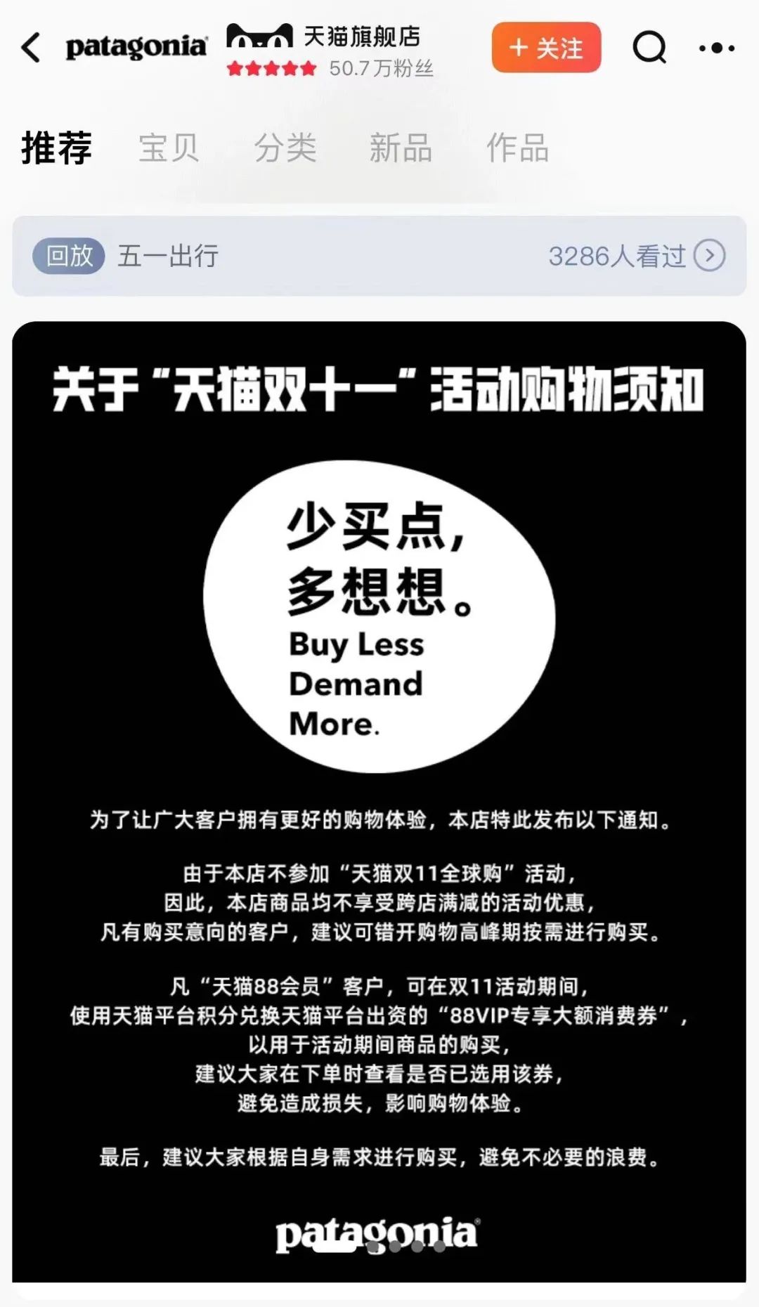 近两年,巴塔哥尼亚以“有态度”在社交网络上出名。去年9月,巴塔哥尼亚宣布把自己捐给地球;今年双11,巴塔哥尼亚又公开表态不参加大促,还劝大家“少买点,多想想”。
