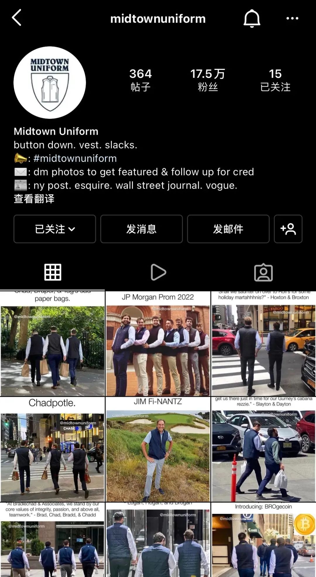 “巴塔哥尼亚背心+衬衫+卡其裤”的搭配甚至被称为“华尔街工服” 或“Midtown Uniform(中城制服) ”。(华尔街即“下城”,是曼哈顿金融区,“中城”是曼哈顿商业中心。)