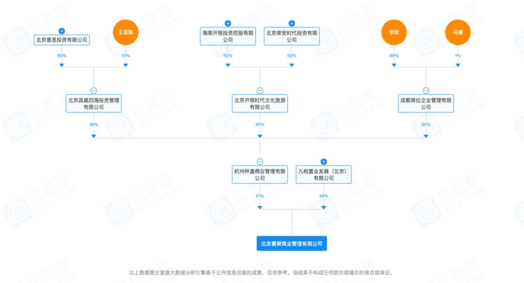 根据企查查上的股权穿透图来看,杭州杯盏商业管理有限公司、九桓置业发展(北京)有限公司分别持有寰聚商业51%和49%的股权,而王思聪占有杭州杯盏35%的股权,为实际控制人。