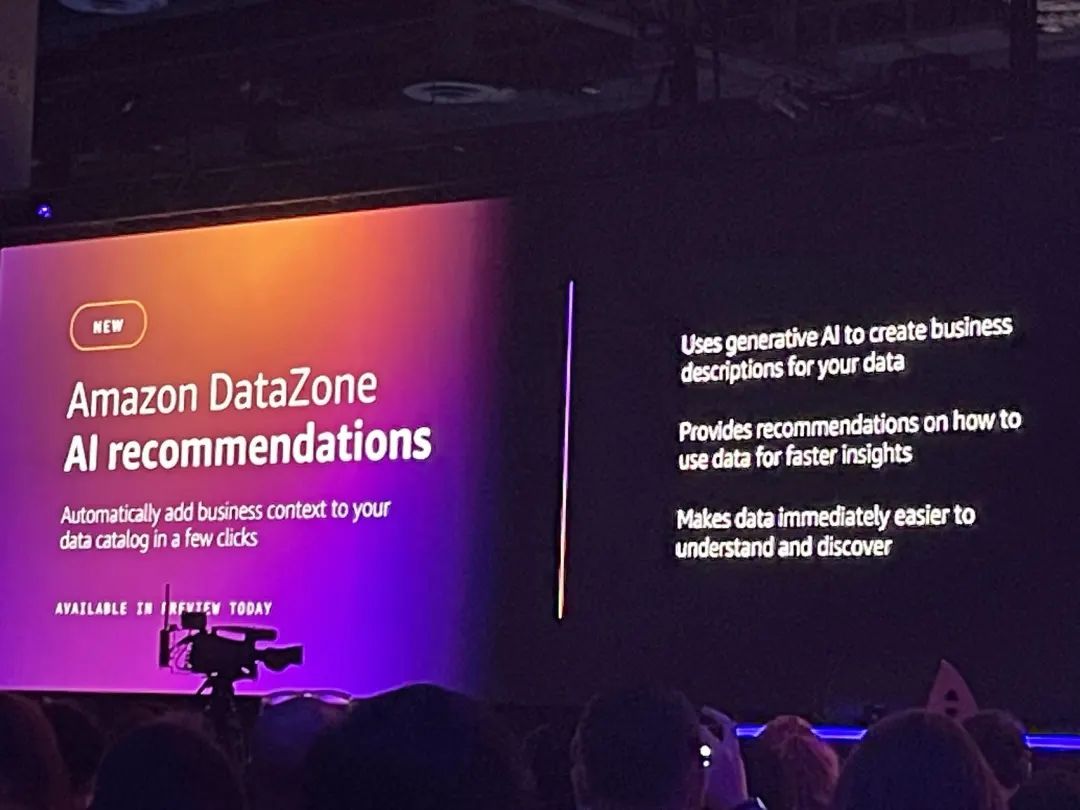 比如AWS的数据管理服务DataZone,在大会上推出了AI推荐(AI Recommendations)功能,将原有企业找数据的过程,转化为让具有价值的数据,主动找到企业。企业只需输入自己的业务需求,DataZone就能够提供相应的数据索引,并为企业提供使用数据的建议。
