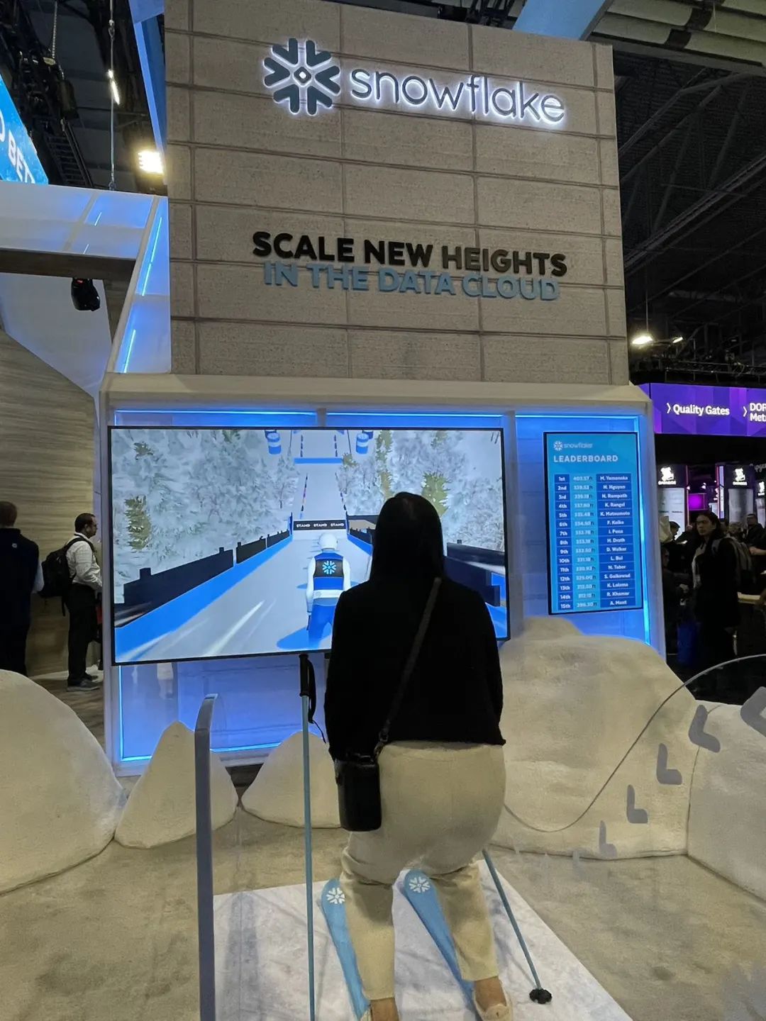 而Databricks的老对手,市值超700亿美元的Snowflakes,则把一整套动捕滑雪游戏搬到了展会现场。