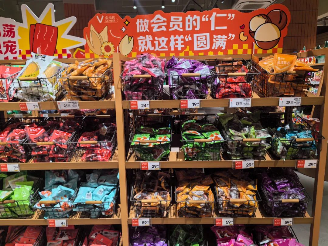 如在售的大开口夏威夷果(400g)降至29.9元/罐、香烤紫衣腰果(500g)会员价降至49.9元/罐;一袋60克的手撕肉脯,会员价5.9元,价格降幅均达40%。已经卖出上亿袋的脆冬枣,从7.9元,直接降至5.9元。