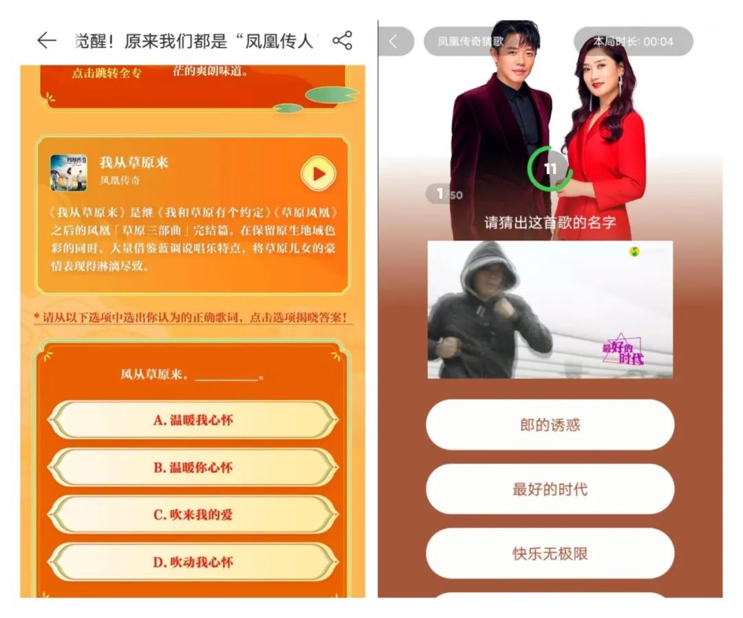同时,网易云在站内的活动页面也上线了一些与凤凰传奇有关的趣味问答活动,通过更轻松的方式让用户知晓活动内容,并扩大凤凰传奇本身内容的影响力。