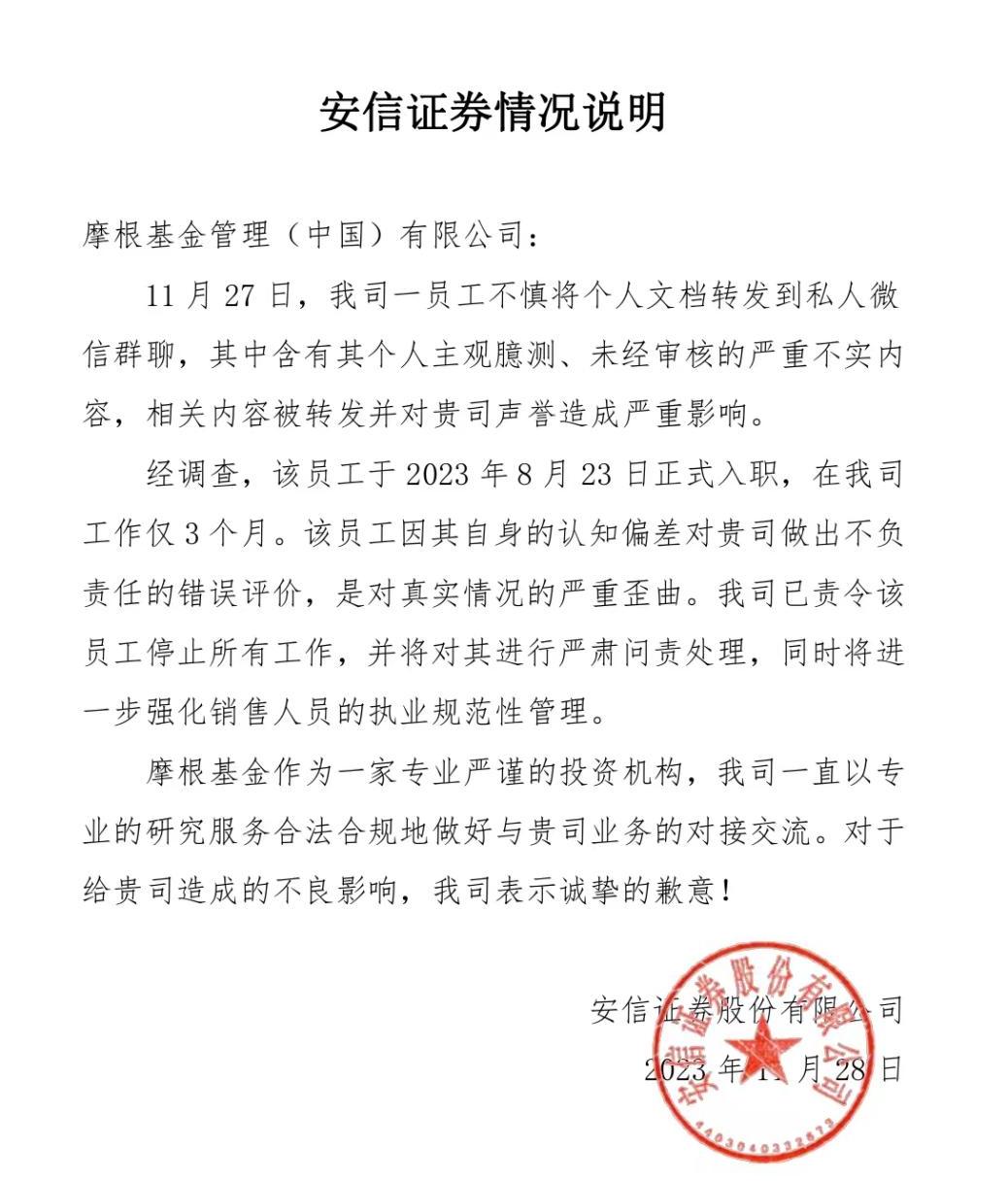 一天后的28日,安信证券发布对该事件的情况说明,其中表示,PPT中含有员工个人主观臆测、未经审核的严重不实内容,相关内容被转发并对摩根基金声誉造成严重影响。