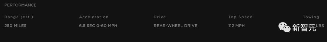 标准续航里程为402公里,0到100公里加速为6.5秒,后轮驱动,最高时速180公里/小时,牵引力为7500LBS。