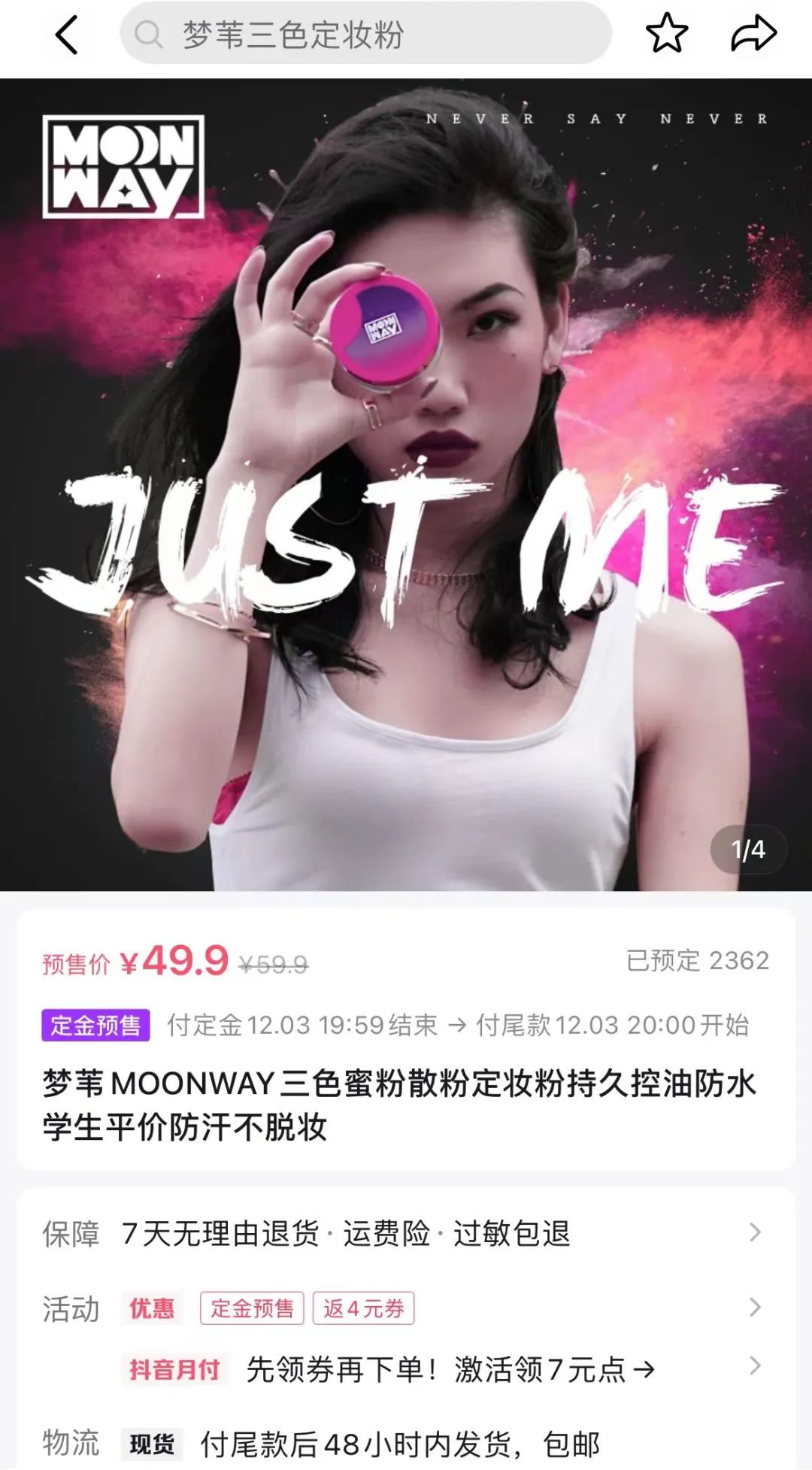 与此同时,抖音账号“小烨同学”和“moonway国潮美妆”也都在10月和11月也发布了关于梦苇新品散粉的预告。据了解,11月23日,淘宝店铺梦苇moonway美妆品牌店已开启新品散粉第一批预售,预售49.9元,上线1000单已经全部拍完;11月28日,抖音店铺梦苇护肤品牌店也开启了散粉预售,截至发稿显示已预定2389件。