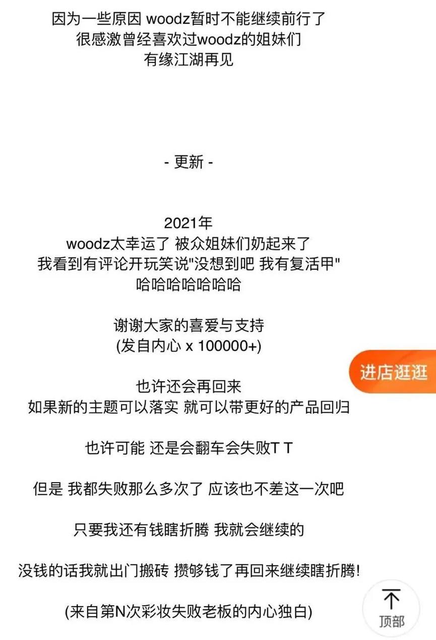 但也并非所有计划关停的彩妆品牌都能因此而重启。Woodzbeauty高木子本计划在2021年清仓闭店,但因为清仓的消息而从小红书获得了一波流量,品牌也曾在店铺详情页写到“被众姐妹奶起来了,也许还会再回来”。但截至目前,Woodzbeauty高木子品牌已经在线上销声匿迹。公开信息显示,高木子桃子小姐十色眼影盘已于2023年1月6日取消备案,高木子所属公司杭州高木子生物科技有限公司也因未按照规定期限公示2022年年度报告而在今年7月被列入经营异常名单。