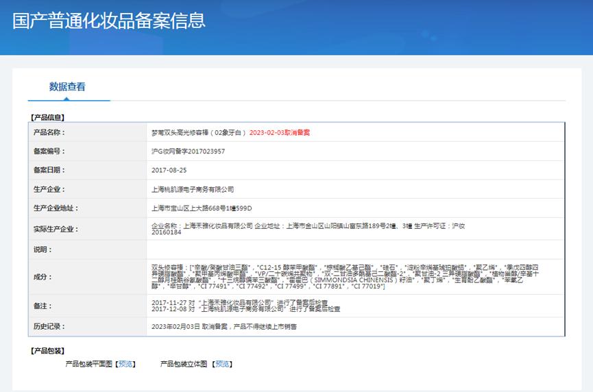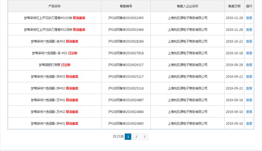 青眼号外注意到,上海桃肌源电子商务有限公司(下称“上海桃肌源”)曾在2017年-2019年备案了25个梦苇moonway彩妆产品,但目前这些产品均显示取消备案”或“已注销”。今年8月,上海桃肌源因通过拼多多店铺“梦苇彩妆旗舰店”销售已取消备案的梦苇樱花亮肤三色蜜粉化妆品而被上海市宝山区市场监督管理局罚款1万元。