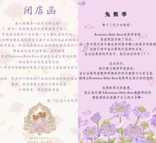 无独有偶,主打洛丽塔文化的彩妆品牌Romance Baby Bear兔熊季也曾在2021年8月在品牌公众号发布“闭店函”,称“因为一些原因我们无法再持续下去了”,店铺也开始清仓促销。时隔近一年后,兔熊季在2022年7月又宣布重启,在公开信中,兔熊季品牌方表示,曾因某些原因导致了闭店,在这一年收到了很多留言和鼓励,“我们决定回来了!”