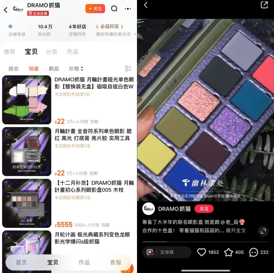 截至目前,抓猫品牌仍在正常经营,淘宝企业店铺DRAMO抓猫销量最高的月轮计划单色眼影显示已售出4万多件,全音符单色眼影也已经售出2万多件。今年10月,抓猫月轮计划系列还推出了与小红书博主“老菇”的联名眼影盘,定价198元,淘宝店铺显示已经售出1000多件。显然,DRAMO抓猫已走出“清仓闭店”的困境。