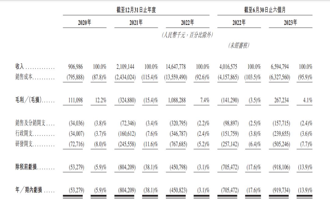 招股书显示,2020年、2021年、2022年及2023年上半年,瑞浦兰钧营收分别为9.07亿元、21.09亿元、146.48亿元及65.95亿元,其中在2020年至2022年间,复合年增长率为301.9%。