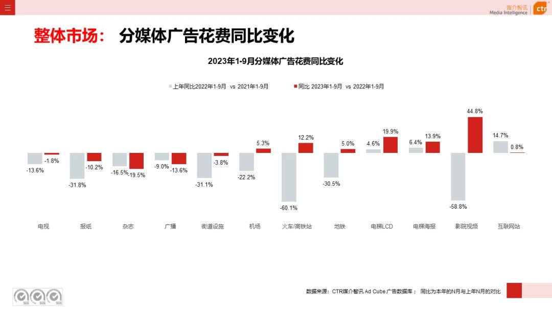 与之形成对照的是梯媒广告的强势增长,根据CTR数据,1-9月,电梯LCD和电梯海报的广告花费同比分别上涨19.9%和13.9%,这一势头还有持续上涨的趋势。