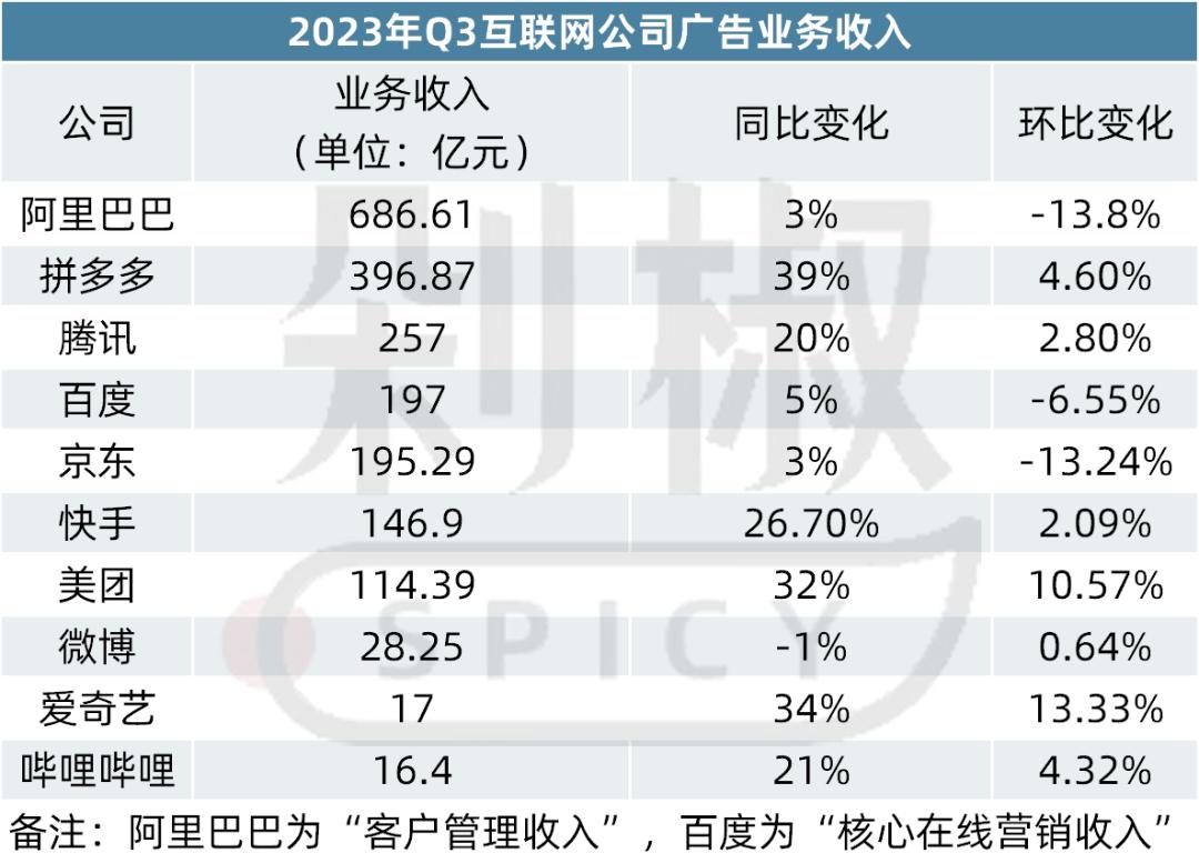 拼多多逆势上涨的个例,被业内人士归功于海外市场的开拓,而非国内市场的助力。大盘数据也为互联网广告的评估提供了更精准的测量尺度,QuestMobile数据显示,互联网广告市场在2023年第三季度同比增长3.6%。CTR(央视市场研究)的数据也交叉印证了互联网广告的走势,其数据显示,今年1-9月,互联网广告增幅仅为0.8%。