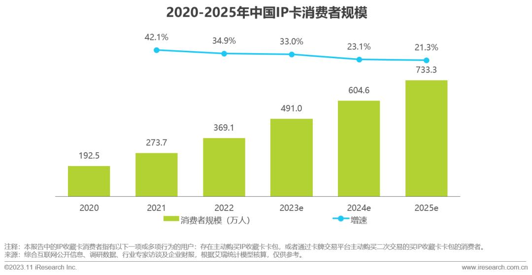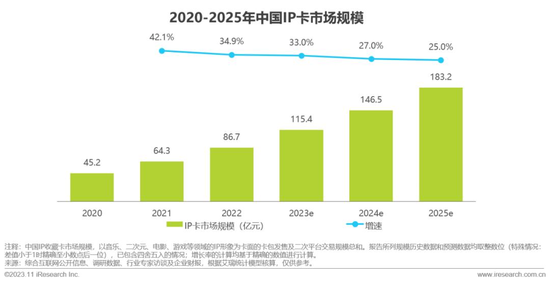 2022年,中国IP卡行业市场规模达到86.7亿元,同比增长34.9%,预计在2025年其市场规模将超过180亿。传统二次元作品及新IP源源不断的产出,持续为IP收藏卡市场注入活力,推动国内IP卡消费市场持续增长。