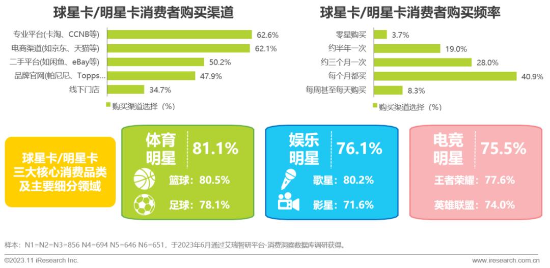 而在购买球星/明星卡的品类分布中,体育、影视音乐和电竞占比较高,而细分层面,篮球、足球、歌星、影星以及王者荣耀和英雄联盟选手的相关卡牌最为受欢迎。