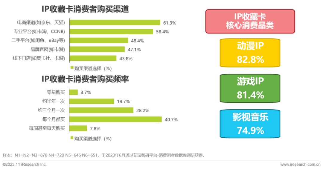 IP收藏卡消费者中,电商渠道占比61.3%是最主要的卡牌购买渠道,其次是占比58.4%的专业平台。并且有高达48.5%的消费者有至少每月购买卡牌的习惯,零星购买者仅3.7%。