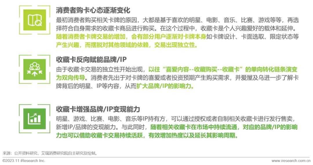 随着收藏卡交易量的增大,消费者参与卡牌交易的心态和出发点也在发生变化。部分用户从最早的兴趣爱好引导购买卡牌,逐渐演变为卡牌交易本身就是兴趣爱好。这个变化产生之后,收藏卡自身就变成了流量入口,从而反向为品牌/IP赋能,并进一步提升IP变现能力。