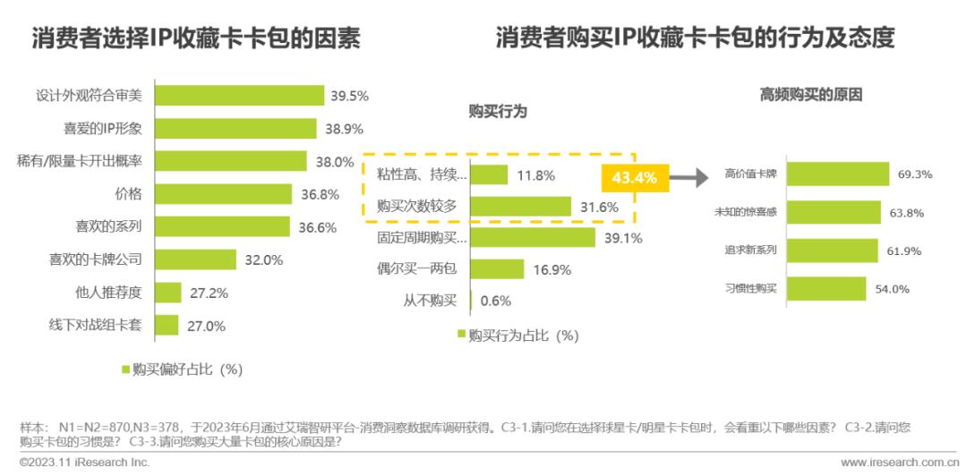 与球星卡/明星卡消费者不同,IP收藏卡消费者选择卡包的核心原因是符合审美的卡牌设计以及喜爱的IP形象,两者选择率分别为39.5%和38.9%。与此同时,有82.5%的消费者会有定期购买卡包的习惯,其中43.4%为高频购买。