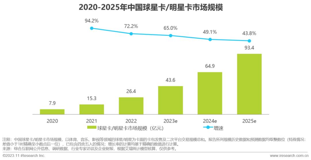 2022年,中国球星卡/明星卡行业市场规模超过20亿元,同比增长72.2%,预计在2025年其市场规模将接近一百亿。泛娱乐的广阔市场,为球星卡、明星卡的发展提供了巨大的增量空间,未来三年球星卡/明星卡市场规模将持续保持40%以上的增速。