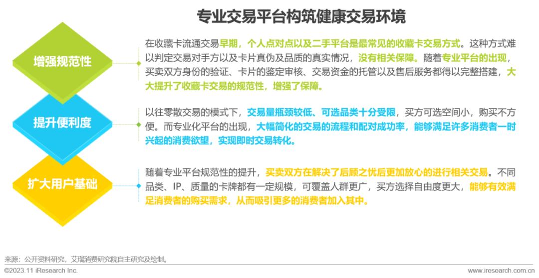 随着eBay、卡淘等国内外交易平台的出现和专业化的提升,收藏卡交易的规范性和保障性进一步提高。与此同时,随着交易量的增大,平台在收藏卡的分类、描述、交易机制和保障机制方面不断升级,方便消费者准确下单,进一步推动收藏卡交易的量级,增加二级市场交易量,帮助收藏卡更好的流通。