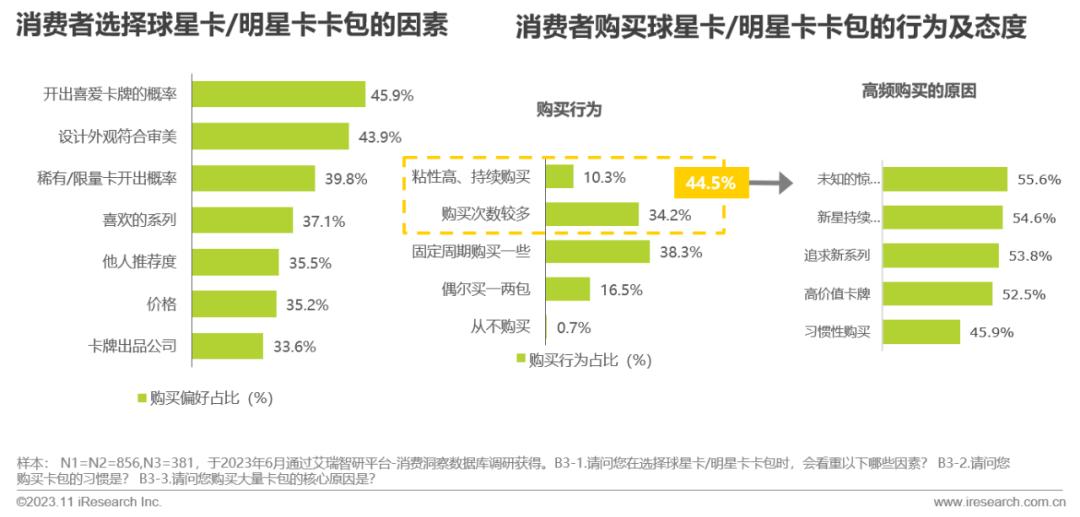 与此同时,有82.8%的消费者会有定期购买卡包的习惯,其中44.5%为高频购买。支撑这部分高频购买者的原因主要有,未知的惊喜感(55.6%)、感兴趣的新星和新系列持续出现(54.6%和53.8%)以及追求高价值的卡牌。还有45.9%的消费者是存在习惯驱动购买的情况。