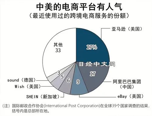 国际邮政合作协会(International Post Corporation)面向世界39个国家的消费者调查了“最近用过的跨境电商服务”,结果美国亚马逊、中国阿里巴巴集团及eBay这些中美电商平台占6成以上。