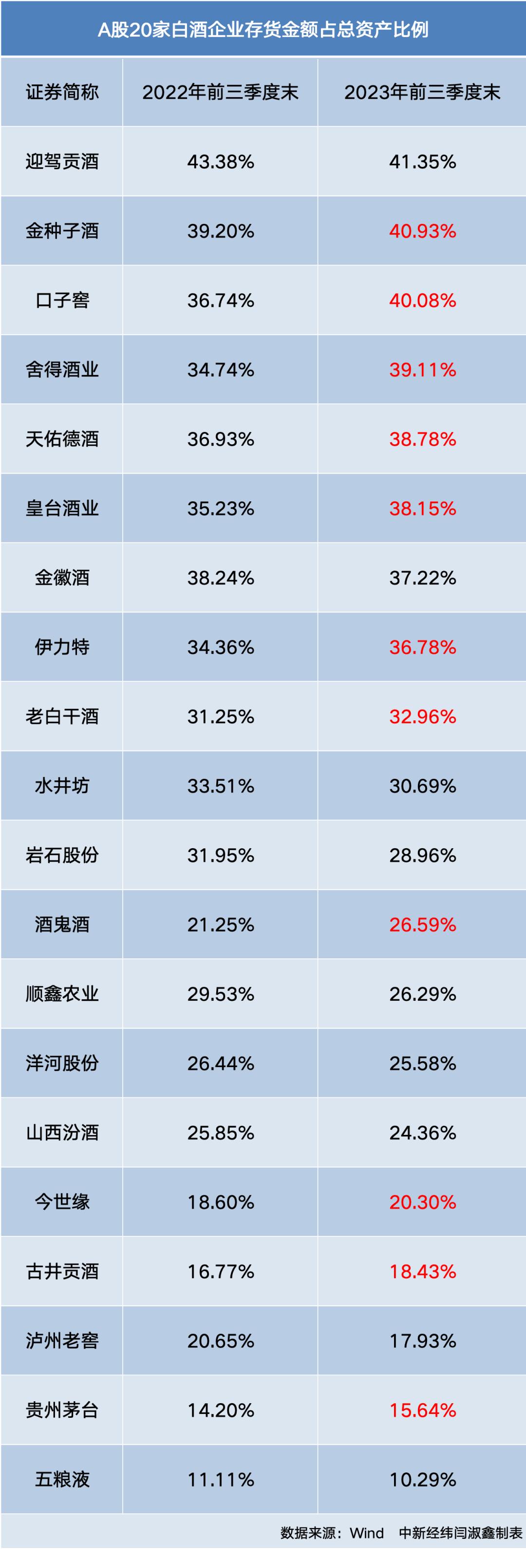▲2022年及2023年三季度末A股20家白酒企业存货金额占总资产比例情况